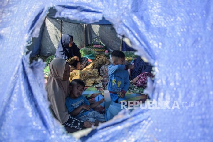 Warga mengungsi di tenda pascagempa bumi di Desa Cibeureum, Kertasari, Kabupaten Bandung, Jawa Barat, Rabu (18/9/2024). Menurut data sementara BPBD Provinsi Jawa Barat, sebanyak 450 warga terpaksa mengungsi, 58 orang luka ringan dan 23 lainnya luka berat dari tiga desa yang terdampak gempa bumi berkekuatan Magnitudo 5,0. (FOTO : ANTARA FOTO/Novrian Arbi)