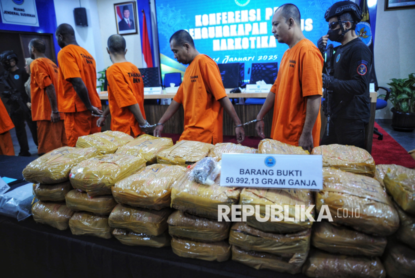 Kepala Badan Narkotika Nasional Marthinus Hukom (dua kanan) menunjukkan barang bukti narkotika saat rilis pengungkapan kasus narkotika di Gedung BNN, Jakarta, Selasa (14/1/2025). Pada periode awal Januari 2025, kolaborasi yang dilakukan oleh BNN bersama BNN Provinsi dengan Kementerian Imigrasi dan Pemasyarakatan (Imipas) serta Direktorat Jenderal Bea dan Cukai melalui operasi bersama berhasil mengungkap 11 kasus tindak pidana narkotika yang dilakukan oleh 44 orang tersangka, diantaranya dilakukan oleh Warga Binaan Pemasyarakatan (WBP) dan Petugas Rutan. Selain itu, dalam operasi bersama, Tim Gabungan juga mengamankan dua warga negara Thailand yang berupaya menyelundupkan narkotika jenis sabu melalui dubur dan dua warga negara Yaman yang menyelundupkan narkotika jenis cathinone dari Singapura ke Jakarta. Dari ke-11 kasus tindak pidana narkotika yang melibatkan 44 orang tersangka tersebut tim gabungan berhasil mengamankan barang bukti berupa 5.259,34 gram sabu, 50.992,13 gram ganja ,45,45 gram ganja sintetis, 63 butir ekstasi, 2.680 butir PCC dan 3.896 gram cathinone. (FOTO : Republika/Prayogi)