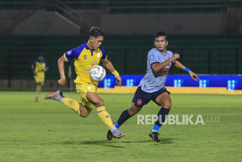 Pesepak bola Barito Putera Eksel Timothy (kiri) mencoba melewati pesepak bola PSIS Semarang Ahmad Syiha (kanan) pada pertandingan Liga 1 di Stadion Sultan Agung, Bantul, DI Yogyakarta, Jumat (29/3/2024). Pada pertandingan itu kedua kesebelasan bermain imbang tanpa gol.