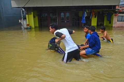 Sejumlah anak menuntun sepeda melewati jalan yang terendam banjir di Desa Temulus, Mejobo, Kudus, Jawa Tengah, Minggu (1/1/2023). Foto: Yusuf Nugroho/ANTARA FOTOIntensitas hujan yang tinggi sejak Jumat (30/12) menyebabkan tiga desa di Kecamatan Mejobo terendam banjir. Foto: Yusuf Nugroho/ANTARA FOTOMeski ketinggian air masih tinggi tampak sejumlah anak dan warga masih beraktivitas.