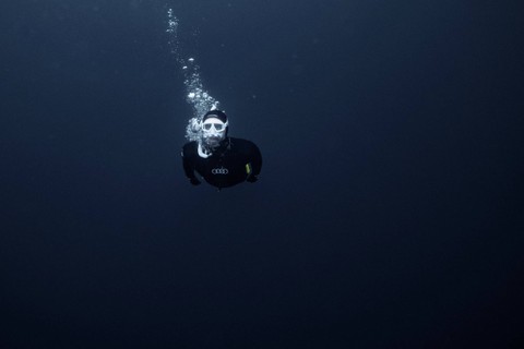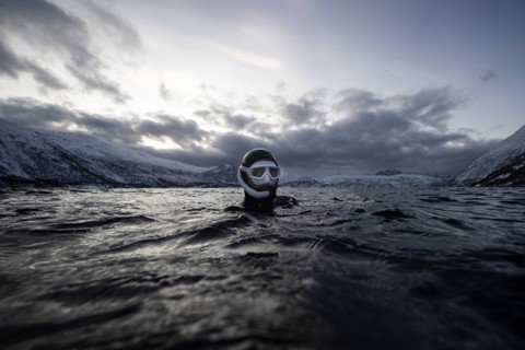 Seekor sirip muncul dari kedalaman yang suram di pulau Spildra di ujung utara negara Skandinavia itu. Guerin-Boeri merupakan pemegang beberapa rekor dunia dalam menyelam bebas di bawah es.