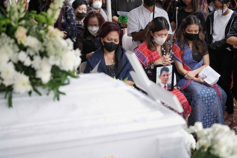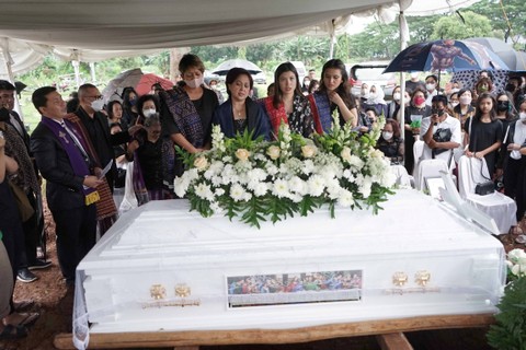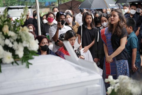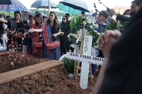 Peti jenazah dimasukkan ke liang lahat pukul 16.08 WIB. Setelah peti masuk, keluarga diminta untuk menabur bunga ke dalam pusara.