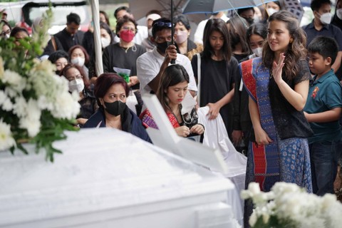 Foto: Agus ApriyantoSaat menabur bunga, Marsha Aruan tampak ingin menangis, namun terus menahannya dengan senyum ikhlas.
