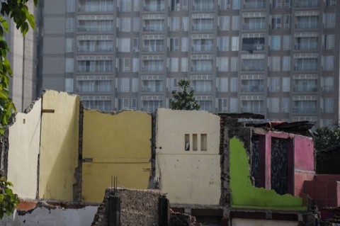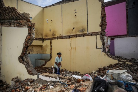 Seorang warga berada di tengah reruntuhan bangunan terdampak proyek pembangunan jalan layang Ciroyom di Andir, Bandung, Jawa Barat, Kamis (5/1/2023). Foto: Raisan Al Farisi/Antara Foto