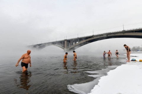 Foto: Alexey Malgavko/REUTERSAnggota klub perenang musim dingin amatir Cryophile berkumpul untuk mandi di perairan sedingin es Sungai Yenisei selama perayaan pesta Epifani Kristen Ortodoks di Krasnoyarsk, Rusia, Kamis (19/1/2023).
