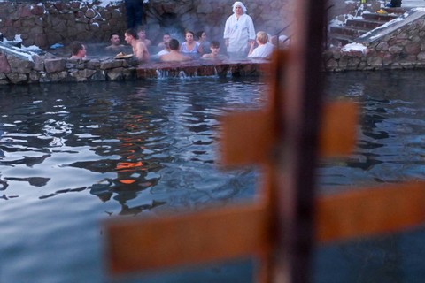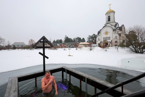 Foto: Evgenia Novozhenina/REUTERSRitual tersebut memperingati baptisan Yesus Kristus di Sungai Yordan, dan para penyembah percaya bahwa dosa-dosa mereka secara simbolis dihapuskan.