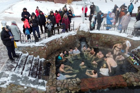 Foto: Alexey Malgavko/REUTERSOrang-orang mandi di kolam saat orang lain berkumpul di dekatnya selama perayaan pesta Epifani Kristen Ortodoks di luar Biara Achairsky di wilayah Omsk, Rusia, Kamis (19/1/2023).