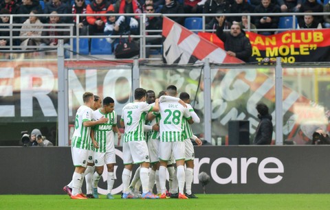 Selebrasi pemain Sassuolo usai mencetak gol ke gawang AC Milan pada pertandingan lanjutan Liga Italia di San Siro, Milan, Italia, Minggu (29/1/2023). Foto: Daniele Mascolo/REUTERS