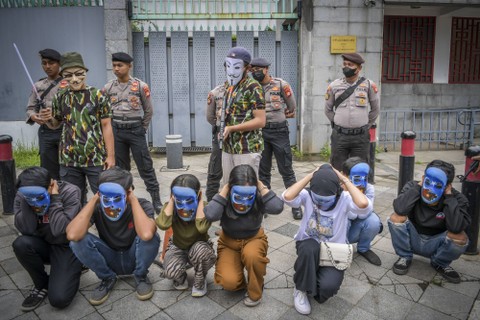 Sejumlah orang dari Aliansi Mahasiswa Islam (AMI) menggelar aksi teatrikal saat menggelar unjuk rasa di depan Kedutaan Besar China, Kuningan, Jakarta, Jumat (3/2/2023).