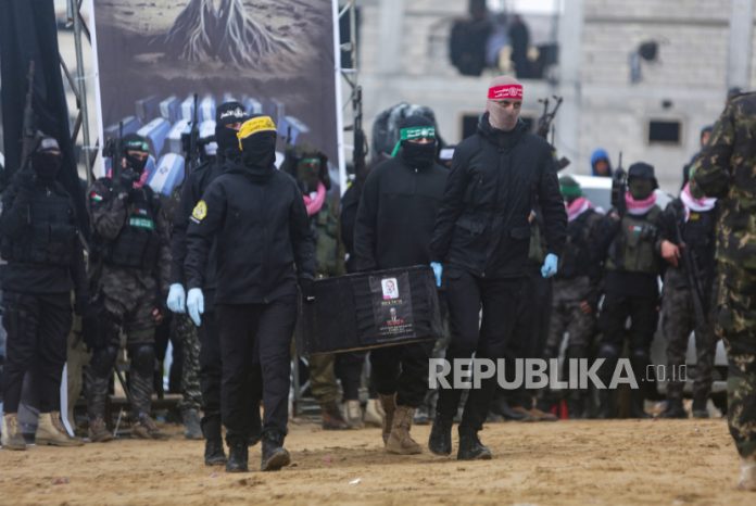 Pasukan Hamas membawa peti jezanah warga Israel di Jalur Gaza selatan, Kamis (20/2/2025).