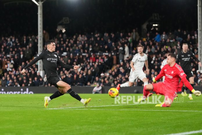 Pemain Manchester City Phil Foden mencetak gol ke gawang Fulham dalam lanjutan Liga Primer Inggris di Craven Cottage, London, Rabu (3/12/2025) dini hari WIB.