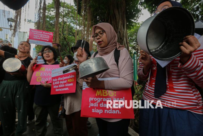 Peserta Aksi yang tergabung dalam Suara Ibu Peduli Makan Bergizi Gratis (MBG) menggelar aksi di kawasan Monumen Nasional, Jalan Medan Merdeka Selatan, Jakarta Pusat, Rabu (1/10/2025). Dalam aksinya, mereka menyoroti sejumlah persoalan program MBG yang bermasalah diantaranya menimbulkan korban keracunan, standar kualitas yang rendah hingga risiko penyalahgunaan anggaran. Karena itu, mereka menuntut pemerintah untuk segera mengevaluasi secara menyeluruh program tersebut. Diantaranya penyaluran MBG dilakukan secara bertahap dan dimulai dari keluarga pra-sejahtera agar tepat sasaran, prioritas penyaluran MBG kepada keluarga di desa dan perkotaan yang rentan krisis pangan dan gizi hingga transparansi program yang melibatkan masyarakat sipil sebagai pengawas independen untuk meminimalisir praktik KKN dalam program tersebut. (FOTO : Republika/Thoudy Badai)