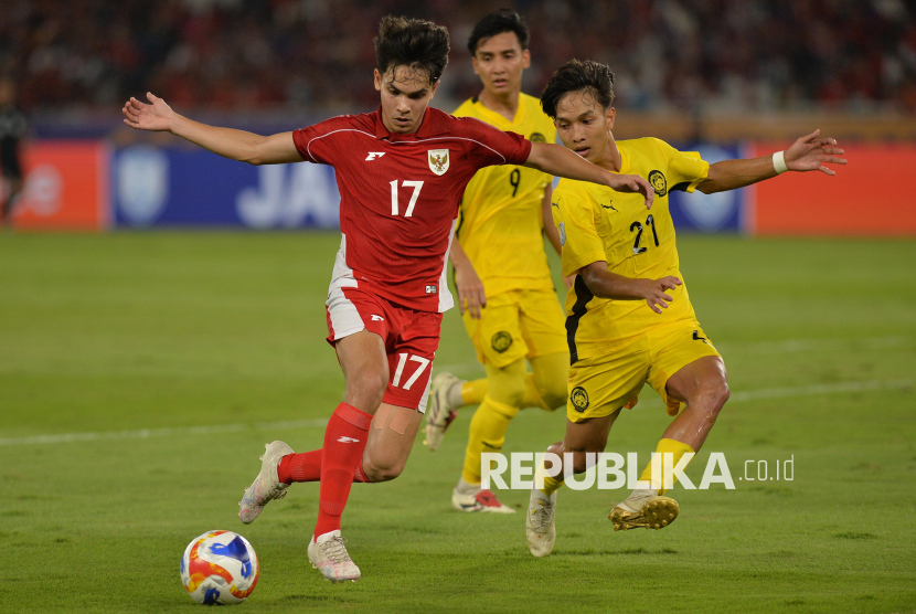 Pesepak bola Timnas U-23 Indonesia Victor Benjamin Dethan berusaha melewati adangan pesepak bola Timnas U-23 Malaysia dalam pertandingan penyisihan Grup A Piala AFF U-23 2025 di Stadion Utama Gelora Bung Karno (SUGBK), Senayan, Jakarta, Senin (21/7/2025).