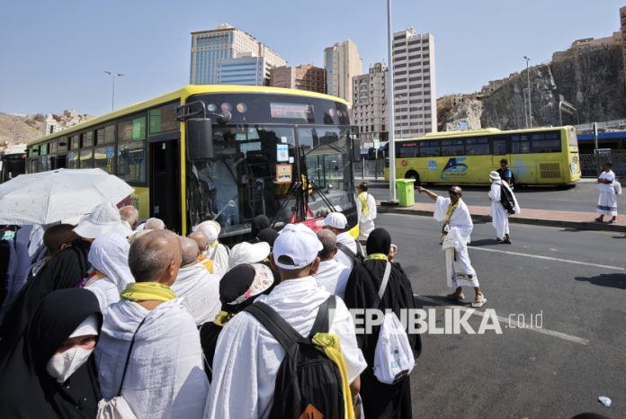 Jamaah haji Indonesia antre memasuki bus Shalawat seusai beribadah di Masjidil Haram di terminal Shib Amir, Makkah, Arab Saudi, Sabtu (21/6/2025). Operasional bus Shalawat akan berhenti per 2 Juli 2025 yakni pada saat jamaah haji Indonesia terakhir berada di Makkah.