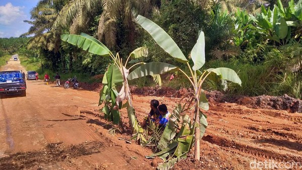 Selanjutnya jalan rusak di Pelalawan juga jadi sorotan publik. Bagaimana tidak, jalan tersebut rusak dan ditanami pisang oleh warga.