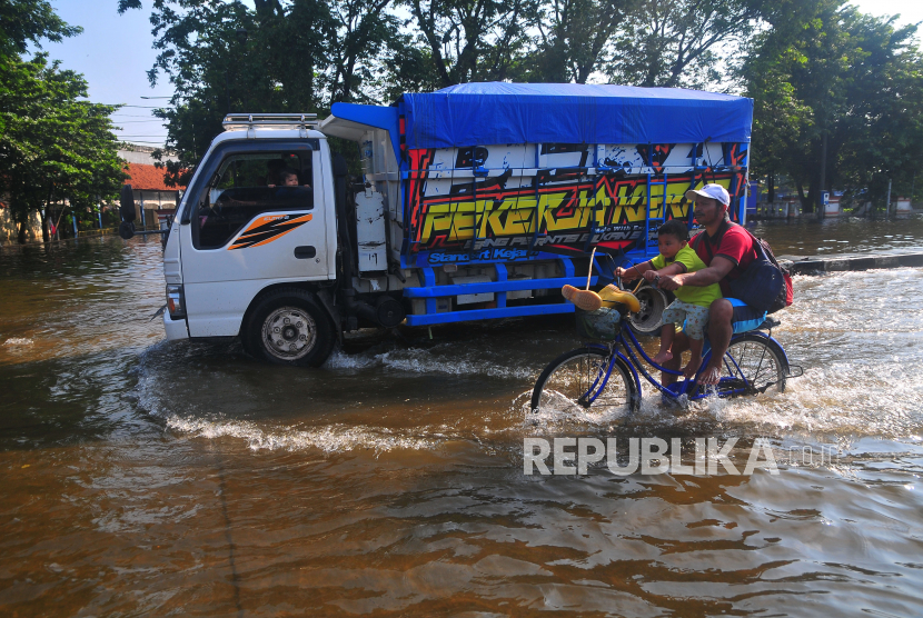 Kendaraan menerobos jalan yang tergenang banjir di jalan raya pantura (ilustrasi). Jalan raya pantai utara (pantura) yang menghubungkan Pulau Jawa dan Bali macet total, pada Senin (3/2/2025) malam.