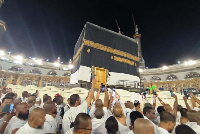 Di tengah proses penggantian kiswah Kabah di Masjidil Haram, Makkah, Arab Saudi pada Selasa (18/7/2023) malam bertepatan dengan awal dari tahun baru Islam pada 1 Muharram 1445 Hijriyah.