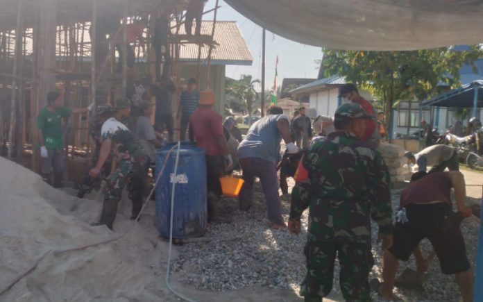 Sejak pagi hari, para prajurit TNI dan warga telah terlihat bahu-membahu mengangkat material, mengaduk semen, dan menuangkan coran ke bagian atas masjid yang sedang dibangun.