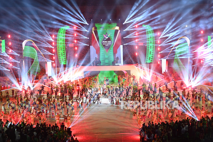 Sejumlah penari tampil pada upacara penutupan PON XXI Aceh-Sumut 2024 di Stadion Utama Sumatera Utara, Sumut Sport Centre, Deli Serdang, Sumatera Utara, Jumat (20/9/2024). Pelaksanaan PON XXI Aceh-Sumut 2024 resmi berakhir dan selanjutnya PON XXII akan diselenggarakan di Provinsi Nusa Tenggara Timur (NTT) dan Nusa Tenggara Barat (NTB) pada tahun 2028. (FOTO : ANTARA FOTO/Nova Wahyudi)