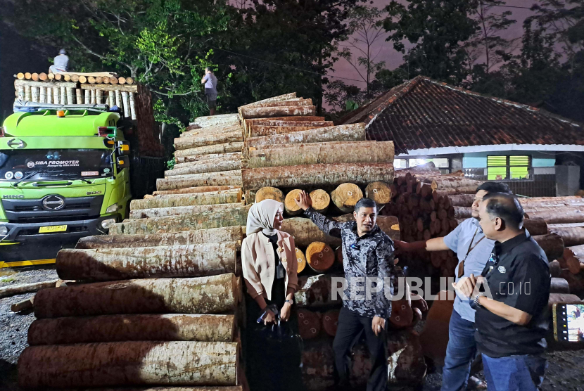 Pemilik CV Kaytama Yudi Eko Santosa (tengah) yang merupakan UMKM binaan BNI Xpora saat ditemui di tempat pengumpulan kayu miliknya di Ciamis, Jawa Barat, Sabtu (27/1/2024).
