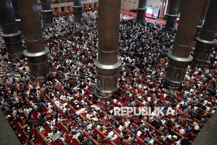 Umat Islam melaksanakan iktikaf di Masjid Istiqlal, Jakarta, Ahad (23/3/2025). Umat Islam menjalankan iktikaf di masjid pada malam ganjil di 10 hari terakhir bulan suci Ramadhan untuk meraih keberkahan Lailatul Qadar atau malam yang dalam Al Quran digambarkan memiliki kemuliaan karena lebih baik dari seribu bulan.