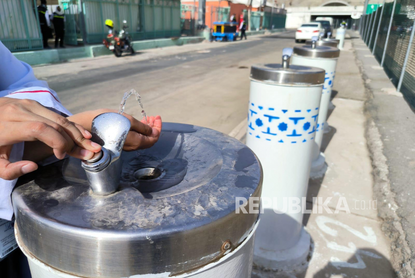Fasilitas minum di Mina, tempatnya berada di pinggir jalan utama, jamaah haji bisa meminum air langsung dari tempat tersebut. Rabu (21/6/2023). (FOTO : Republika/Fuji Eka Permana)