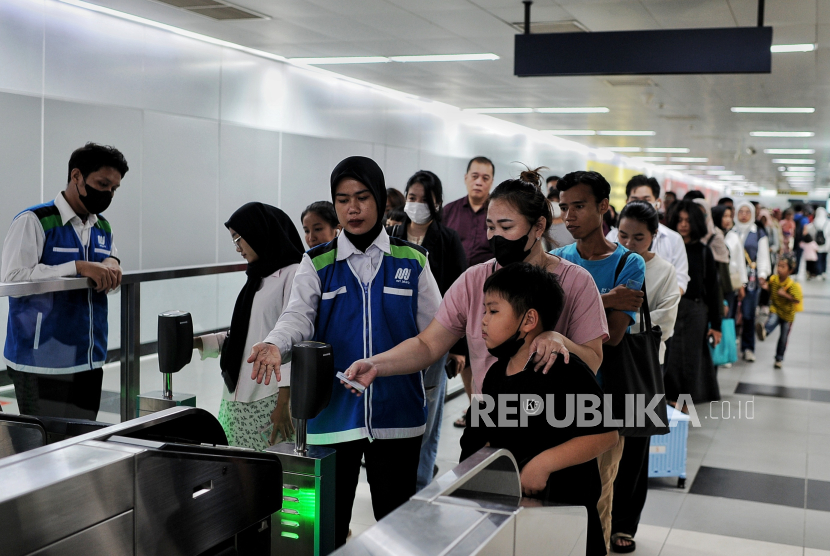 Penumpang mengantre untuk menempelkan kartu uang elektronik sebelum menaiki kereta MRT di Stasiun Bundaran HI, Jakarta, Ahad (23/6/2024). Pemprov DKI Jakarta menerapkan tarif Rp1 untuk layanan transportasi publik seperti MRT, LRT Jakarta dan Transjakarta mulai dari 22-23 Juni 2024 hari ini dalam rangka HUT ke-497 Jakarta. Pemberlakukan tarif Rp1 ini berlaku pada pukul 00.00-23.59 WIB.