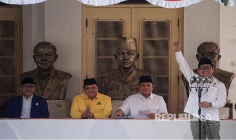 Ketua Umum PKB Muhaimin Iskandar menyampaikan sambutan pada deklarasi dukungan Pilpres 2024 disaksikan Ketua Umum PAN, Ketua Umum Partai Golkar, Ketua Umum Partai Gerindra di Museum Perumusan Naskah Proklamasi, Jakarta, Ahad (13/8/2023). (FOTO : Republika/Prayogi)