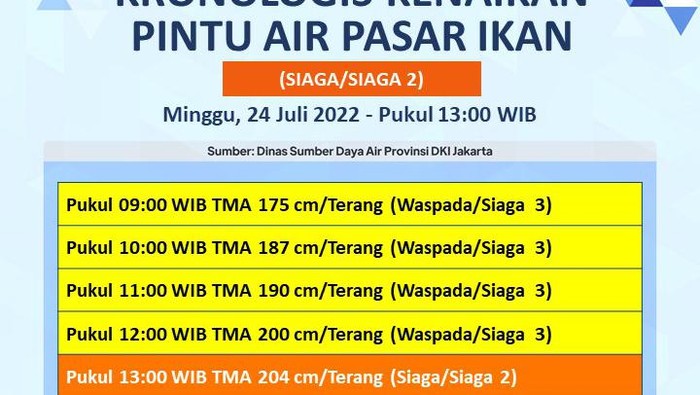 Status siaga 2 dilaporkan oleh BPBD DKI Jakarta melalui akun Twitternya, @BPBDJakarta. Pintu air pasar ikan mulai siaga 2 pada Minggu (24/7/2022), pukul 13.00 WIB.