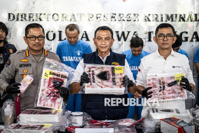 Direktur Reserse Kriminal Umum Polda Jawa Tengah, Kombes Pol Dwi Subagio (tengah), Kepala Perwakilan Bank Indonesia Jateng Rahmat Dwisaputra (kanan), dan Kabid Humas Polda Jawa Tengah Kombes Pol Artanto (kiri) menunjukkan barang bukti saat rilis pengungkapan peredaran uang palsu di Polda Jawa Tengah, Semarang, Jawa Tengah, Selasa (5/8/2025). Ditreskrimum Polda Jawa Tengah mengungkap kasus peredaran uang palsu dengan mengamankan enam orang tersangka dan barang bukti berupa 410 lembar uang palsu pecahan Rp100.000, satu unit printer, alat sablon, dua bendel kertas putih jenis white kraft, serta uang tunai Rp3 juta.