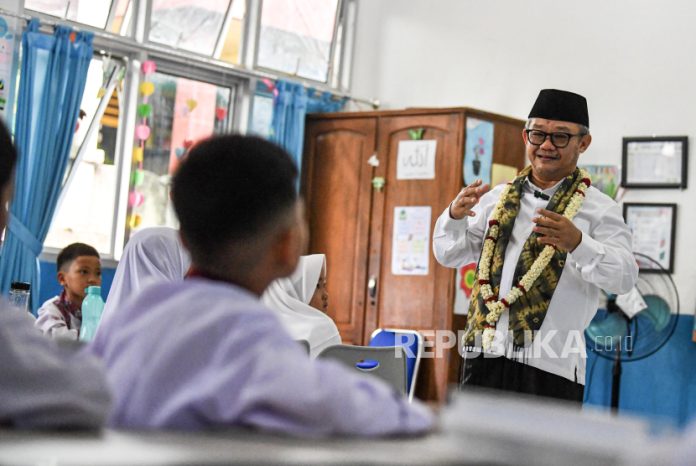 Menteri Pendidikan Dasar dan Menengah (Mendikdasmen) Abdul Muti (kanan) menyampaikan materi saat mengajar di SDN 59 Palembang, Sumatera Selatan, Jumat (1/11/2024).