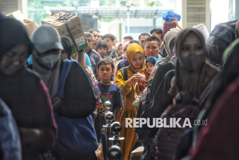 Sejumlah pemudik kereta api jarak jauh mengantri untuk memasuki peron di Stasiun Pasar Senen, Jakarta, Ahad (23/3/2025). Kondisi stasiun Pasar Senen saat ini terlihat lebih ramai terutama di area tunggu yang dipenuhi pemudik dengan membawa koper dan bungkusan kardus yang siap dibawa pulang ke kampung halaman. Sepekan menjelang Idul Fitri, Sejumlah warga memilih mudik lebih awal untuk menghindari kepadatan penumpang dan kesulitan mendapatkan tiket kereta pada arus mudik 2025. Selain itu pemudik memilih untuk pulang lebih awal agar dapat menghabiskan waktu lebih lama di kampung halaman. (FOTO : Republika/Prayogi)